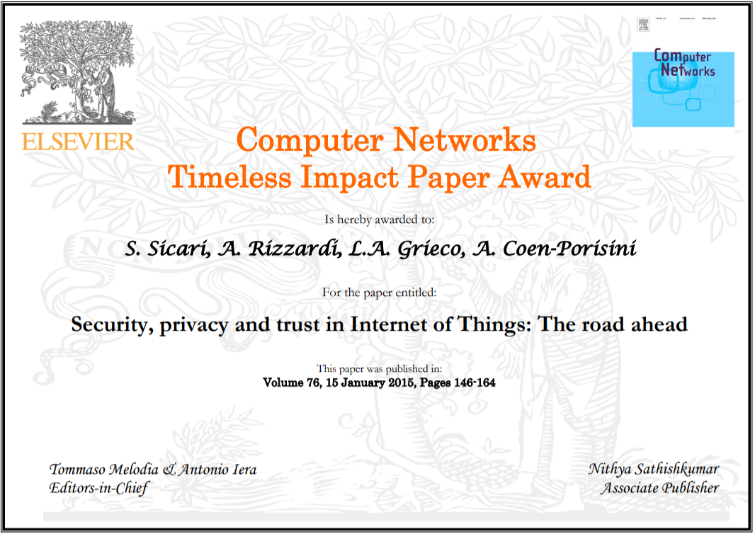 - Winner of the "Computer Networks Timeless Impact Paper Award" from Computer Networks journal (Elsevier), 2021, to the paper "Security, privacy and trust in Internet of Things: The road ahead", authors: Prof. Sabrina Sicari, Prof. Alessandra Rizzardi, Prof. Luigi Alfredo Grieco, Prof. Alberto Coen-Porisini