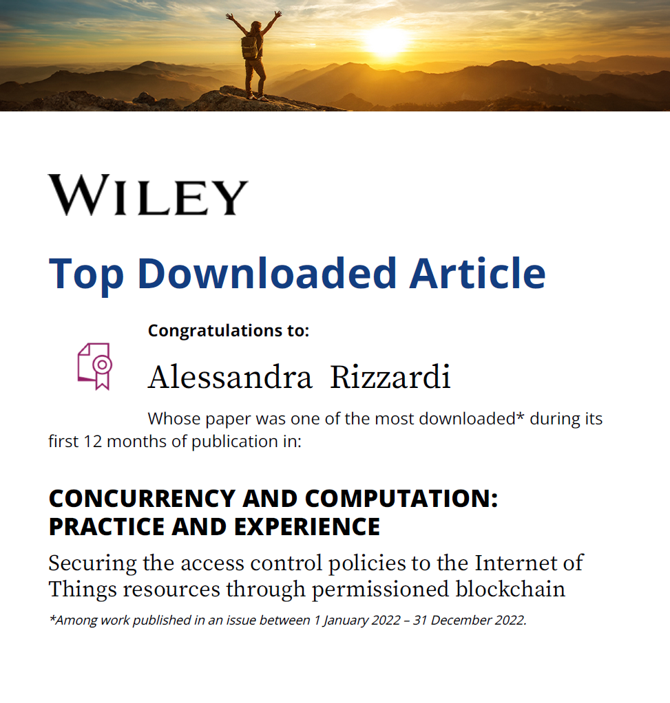 - Winner of the "Top Downloaded Article" Concurrency and Computation: Practice and Experience (Wiley), 2022, to the paper "Securing the access control policies to the Internet of Things resources through permissioned blockchain", authors: Prof. Alessandra Rizzardi, Prof. Sabrina Sicari, Dr. Daniele Miorandi, Prof. Alberto Coen-Porisini